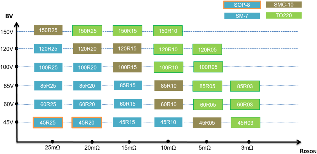 Синхронный выпрямитель используется в качестве альтернативы традиционным выпрямителям на диодах Шоттки для повышения КПД за счет меньшего падения напряжения и меньших потерь энергии в виде тепла. Dongke Semiconductor производит широкую номенклатуру синхронных выпрямителей с рабочим напряжением от 45 до 150 В и сопротивлением открытого канала от 3 до 25 мОм в различных корпусах: TO-220, SOP-8, SM-7, SMC-10.